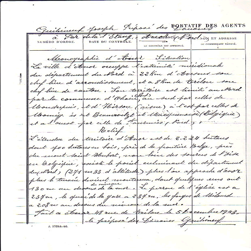 ... Je me souviens... à Siguer, à Le Palais, de Joseph et Florentine quand ils parlaient de Anor: La Galoperie, Par delà l'Etang, la rue de Trélon, l'étang de Milourd, les nuits dans les bois, l'ombre pendant la guerre (Mme Gomet se rappelle), les voyages en Bretagne pour ramener quelque nourriture, le repli momentané à Paris, où Florentine se fît voler la paie de Joseph dans une église, le départ des Allemands et les jeunes cachés lors de leur pasage, Joseph mis en joue impasse de la passerelle, puis le retour de Pierre, qui rentrait d'Allemagne, et fût lui aussi ensuite douanier à Anor. Au début, il dormait sur une planche, sursautait au moindre bruit.... Joseph qui ressemelait ses chaussures, usées par les premiers bals renaissants...Pierre fût ainsi mon parrain. Je me souviens aussi de ce qu'ils disaient, quand ils parlaient de ces bals, et surtout, de la tarte au sucre, bien craquante, au goût inimitable,(recette de Bernard Patrisot) qui était le dernier gateau mangé dans ces soirées... . Je me souviens quand ils parlaient de l'installation de Pierre et Julitte, de la naissance de André et Françoise; avec Marie-Thérèse, nous sommes quatre 'Guihéneuf' nés à Anor.. Je me souviens quand ils parlaient de la durée du trajet en train, de Férel à Anor, de Mr Briand, leur ami, de la chaleur des 'Gens du Nord', de mr et mme Gomet. Puis Bordeaux 3 ans, Brezan, et Siguer, 1949. |